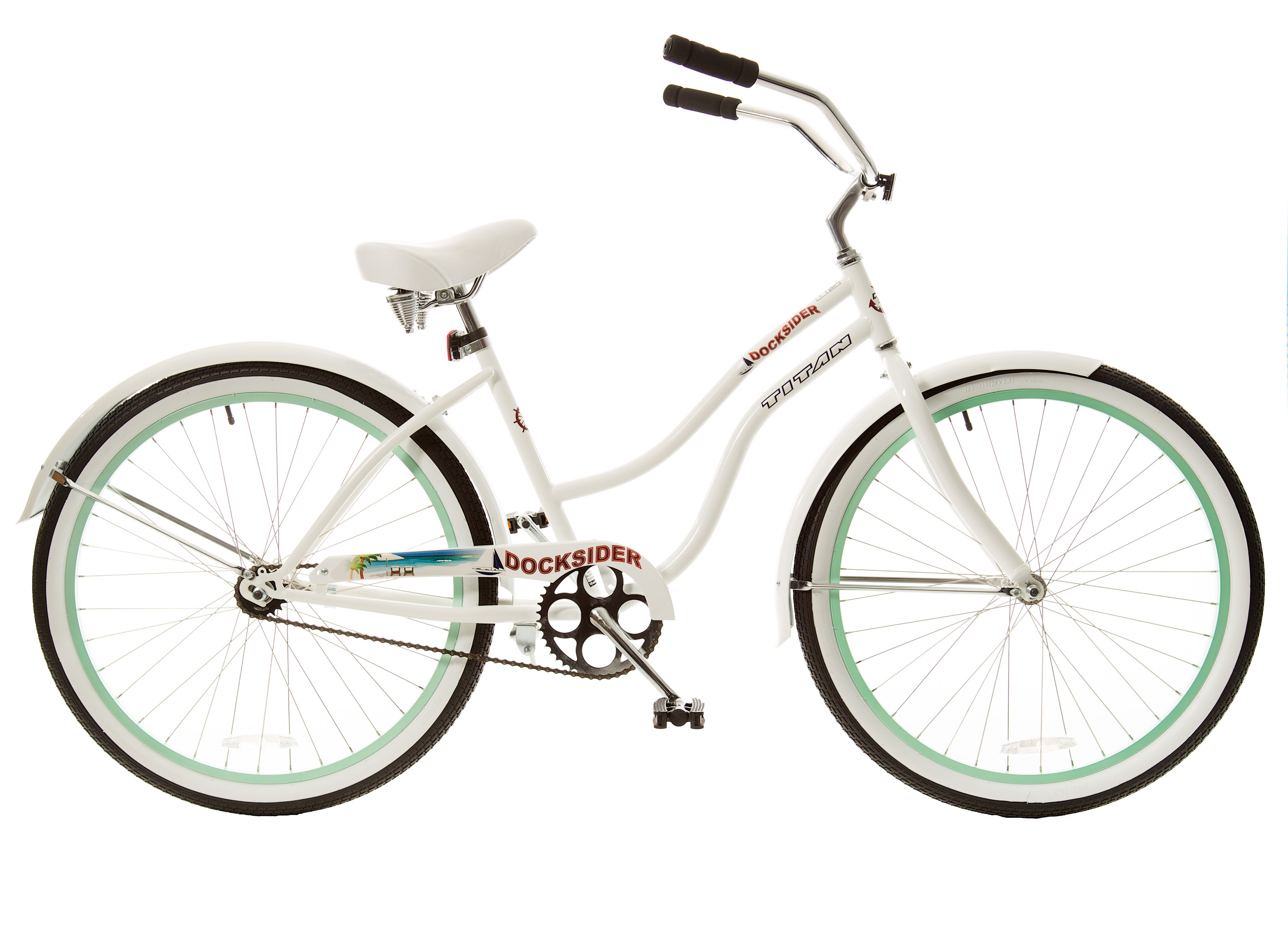 Related Product Titan Docksider Single Speed Women's Beach Cruiser Bicycle, White with Mint Green Wheels, 26-Inch Wheels, 17-Inch Frame