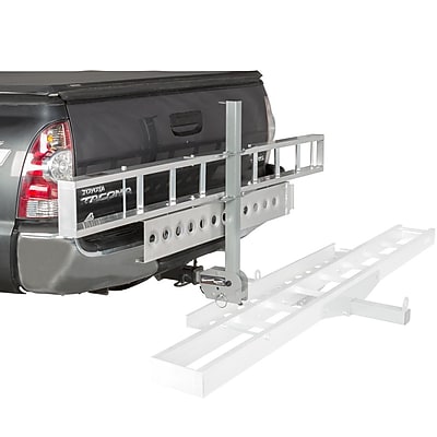 Hauls a single motocross off-road MX or dirt bike with a 2 Class III/IV hitch receiver 75L carrier track with 6.75W rung spacing 27 clearance from folding adapter hitch pin to carrier 45.5 Loading ramp with a 0.67 hook attaching lip